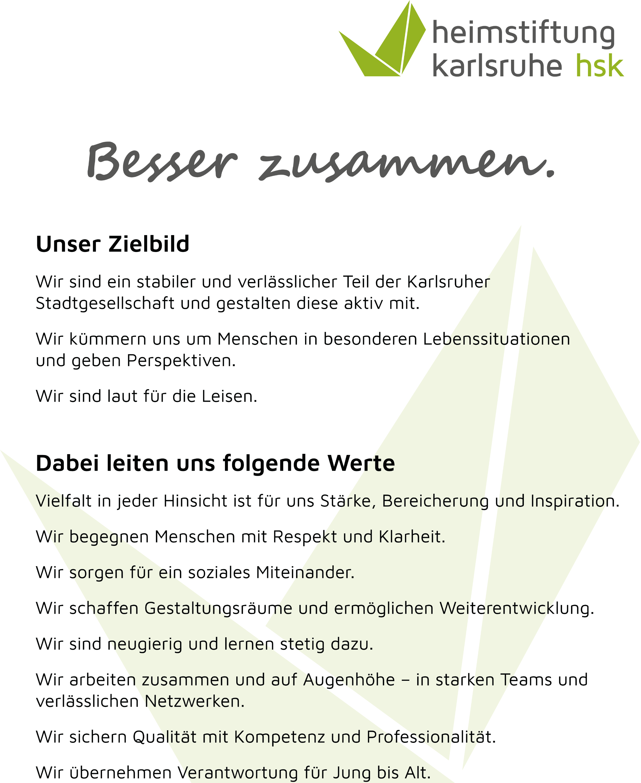 Anlässlich unseres Jubiläums hatten wir uns vorgenommen, unser Leitbild zu überarbeiten. Eine Gruppe mit Teilnehmer*innen aus verschiedenen Einrichtungen und Bereichen der hsk traf sich seit 2023 regelmäßig zur Arbeit am neuen Leitbild. Für den Feinschliff wurde die Arbeitsgruppe unterstützt von einem externen Coach. Im November 2025 konnte das Ergebnis präsentiert werden und es fand durchweg positiven Anklang. Wir freuen uns, dass wir mit unserem neuen Leitbild noch besser ausdrücken können, wofür wir stehen, wie wir arbeiten und wie wir miteinander umgehen.